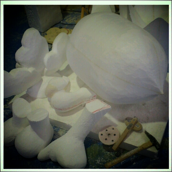 発泡スチロールを型板を使って切出し、大まかな形状を削っています。