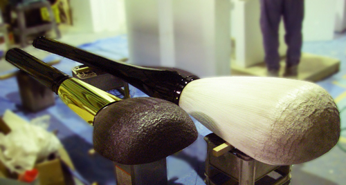 サンプルの筆をもとに発泡スチロールで原型から製作しました。毛並の部分を樹脂でテクスチャー付けしたり、メイクブラシの金属部分をメッキ塗装するなど細部の素材の違いがでるように表現しました。