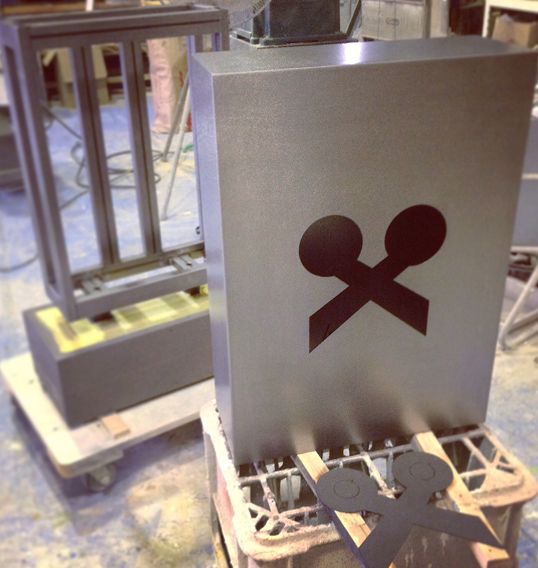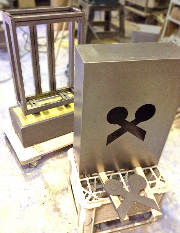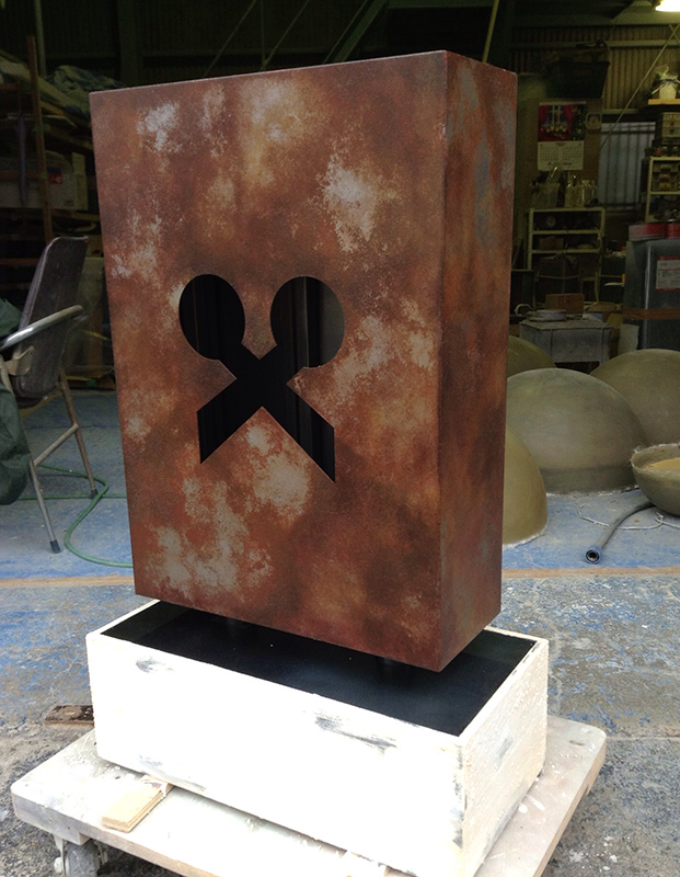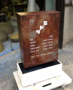 鉄の下地に錆エージング(塗装技術の手法)を施しました。屋外に置いても塗装がはがれないように、ウレタン塗装後にクリアで仕上げました。価格表はステンシルでペイントしています。 本当に錆びてしまうと穴が開いたり劣化していってしまいますが、エージング塗装なので下地が腐食することなく、風合いを表現することができます。錆の入り具合も資料などをもとに調整が可能です。
