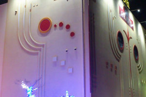 木材で製作、水性塗料で塗装しました。ロゴ、看板はシートを貼りました。