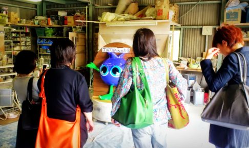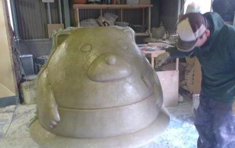作品名:羽釜たぬき 設置場所:岡山県 セルフうどん店「あなぶきや」 制作時期:2010年6月~ 製作期間:約1か月 うどん屋さんのイメージキャラクターのたぬきです。羽釜の中に入っています。 全長約2メートル。 発砲スチロ…