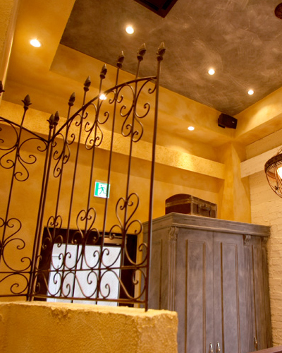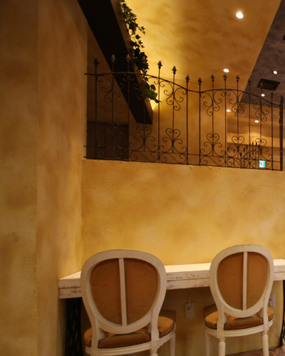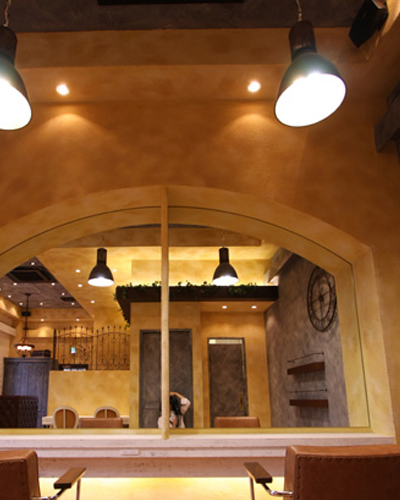 壁面、什器、床面などをアンティーク調に仕上げる、エージングという手法の塗装工事を行いました。