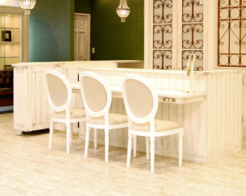 壁面、什器、床面などをアンティーク調に仕上げる、エージングという手法の塗装工事を行いました。