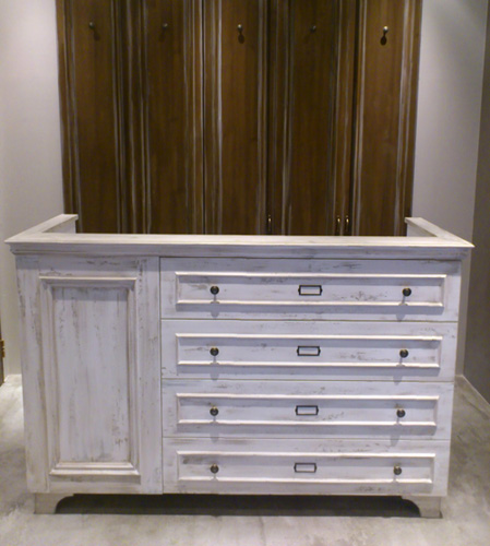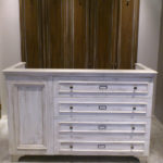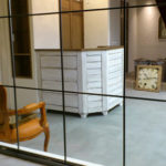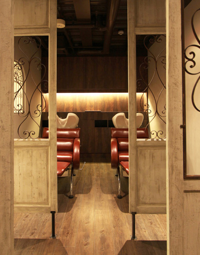 建具、レジカウンター、床、クローゼット、パーテーションなどをアンティーク調に仕上げる、エージングという手法の塗装工事を行いました。 美容院のエージングシリーズ。使用する色の種類や、エージングのパターンなどシリーズ化することで効率化を図っています。
