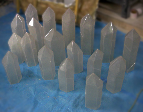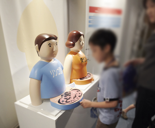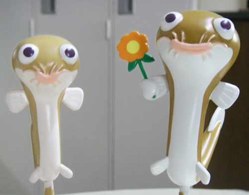 顔の大部分が目で構成されているキャラクターで、イラストのイメージをできるだけ引き継げるよう努力しました。スケッチ風の言原画イラストの雰囲気をFRPで再現するために原型やミニチュア製作の段階で細かく打合せをしました。背景のステージは木目調のタッチ付けをしました。