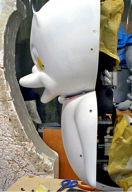 FRPは中が空洞なので、メカの内蔵などの加工が可能で、動きに合わせて造形を調整しながら仕上げます。