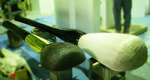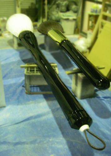 この熊野筆の巨大レリーフです。サンプルの筆をもとに発泡スチロールで原型から製作しました。毛並の部分を樹脂でテクスチャー付けしたり、短い方のメイクブラシの金属部分をメッキ塗装するなど細部の素材の違いがでるように表現しました。