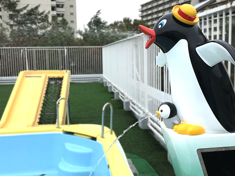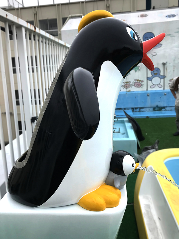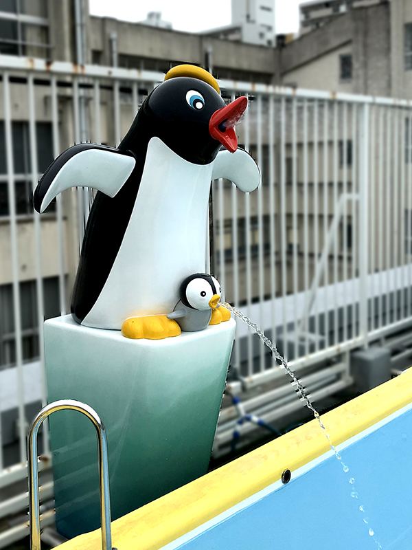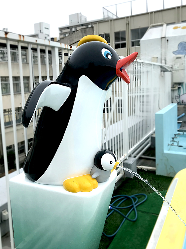 ペンギンキャラクターの口から水がでる仕組みになっていて、噴水の水勢を調節したり長年使う際のメンテナンスのしやすさにこだわって製作しました。