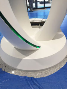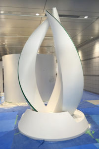 某上場企業様の研修施設のエントランスに設置されたこのモニュメントはLEDが内蔵されていてライン状に点灯する仕組みになっているので、電子部品を取り扱う他社様と連携をとりながら仕上げていきました。